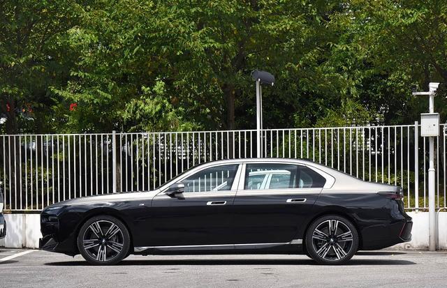 再来看车身侧面部分,5391mm的车身长度赋予了i7修长而优雅的侧面轮廓,车身侧面线条流畅而富有力量感,C柱的霍夫迈斯特拐角得以保留,彰显宝马的经典设计基因。M运动套件的加入让车身侧面线条更加硬朗,黑色高光侧裙和窗框饰条进一步强调了其运动属性。流畅的车顶线条从B柱开始缓缓下滑,形成经典的溜背式造型。隐藏式门把手不仅提升了科技感,更优化了空气动力学性能,使整车风阻系数降低。21英寸M专属轮毂采用轻量化设计,搭配高性能轮胎,既保证了视觉冲击力,又提供了出色的抓地力。